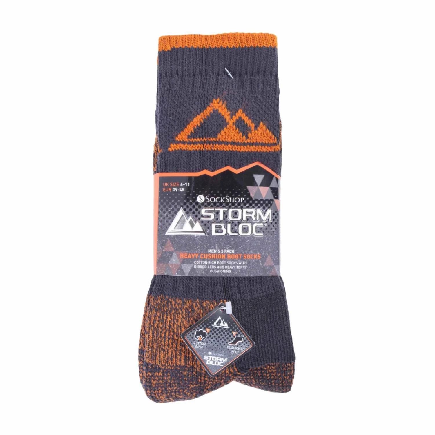 These Storm Bloc luxury boot socks are available in 4 colours including Stone, Black, Charcoal and Navy. They are available in size 6-11 UK / 39-45 EU / 7-12 US and are made from 80% cotton, 17% Polyester, 3% Elastane. They come in a 3 pair pack and are Machine Washable.