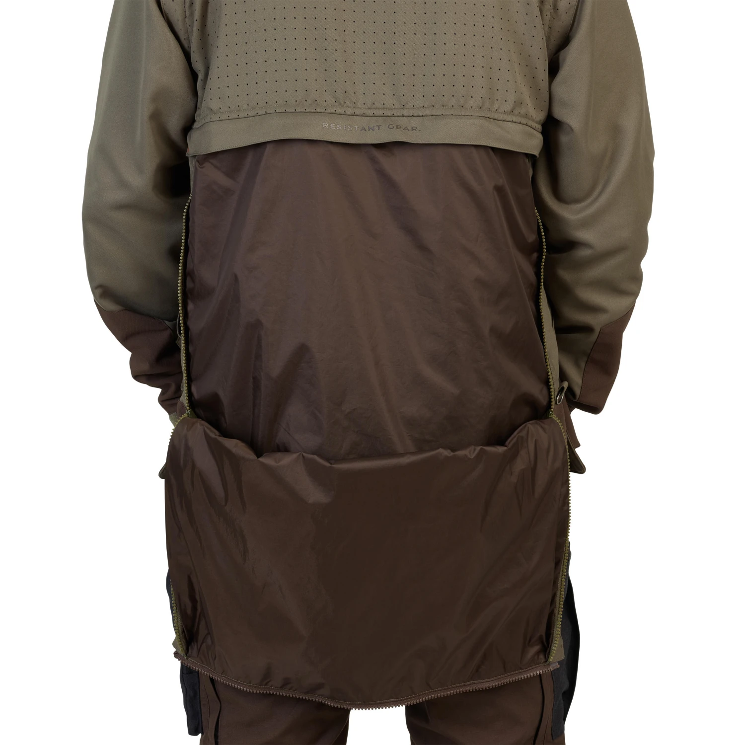 Our hunting jacket has a ring on the right-hand side that makes it easy to carry a bird carrier. The wrists are elasticated and can be adjusted using a hook-and-loop strap. On the top are two remote-control holders. At the rear, a large game bag, quickly accessed by means of three zips (two side zips and one horizontal zip for a complete opening), is a great place to hold the game you have taken. Note that its inner fabric component makes it easy to wash and clean.